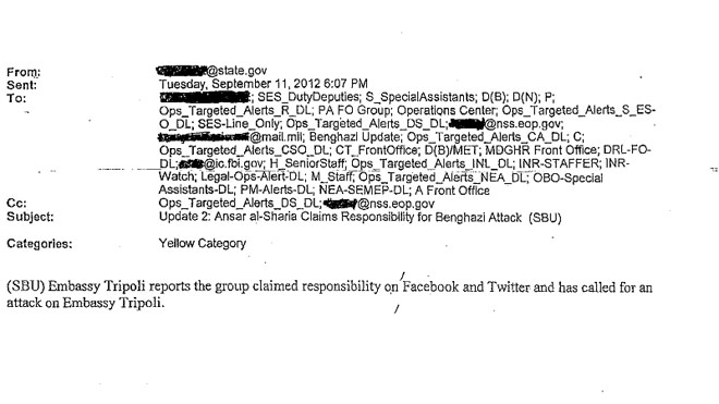This email confirms that, at 6:07 PM EST, the White House was informed that Ansar al-Sharia, an Al-Qaeda affiliate, claimed responsibility for the Benghazi attack, and called for an attack on the Embassy in Tripoli.